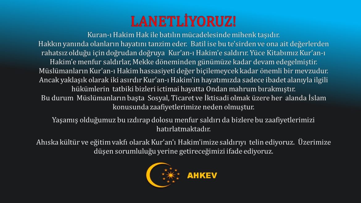 Bu durum Müslümanların başta Sosyal, Ticaret ve İktisadi olmak üzere her alanda İslam konusunda zaafiyetlerimize neden olmuştur. Yaşamış olduğumuz bu ızdırap dolosu menfur saldırı da bizlere bu zaafiyetlerimizi hatırlatmaktadır. Ahıska kültür ve eğitim vakfı olarak Kur’an’ı Hakim’imize saldırıyı telin ediyoruz. Üzerimize düşen sorumluluğu yerine getireceğimizi ifade ediyoruz.
